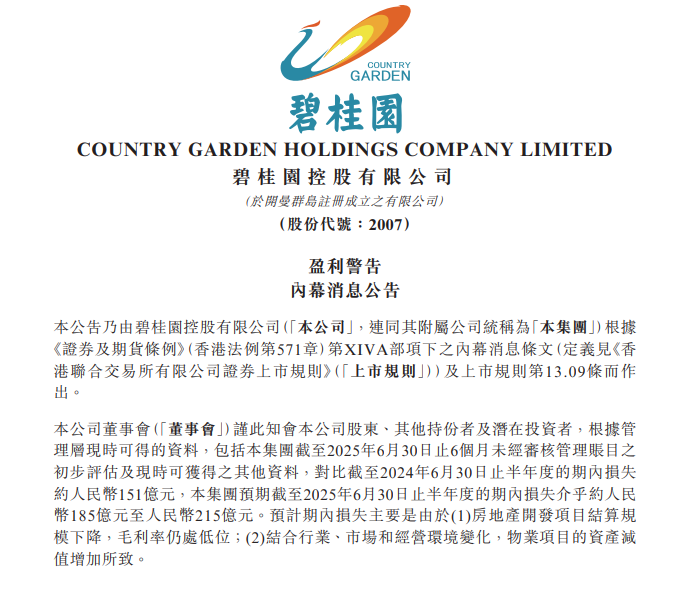 8月22日晚,碧桂园公告称,对比截至2024年6月30日止半年度的期内亏损约人民币151亿元,预计截至2025年6月30日止半年度的期内损失介乎约人民币185亿元至215亿元。预计期内损失主要是由于房地产开发项目结算规模下降,毛利率仍处低位,以及物业项目的资产减值增加所致。