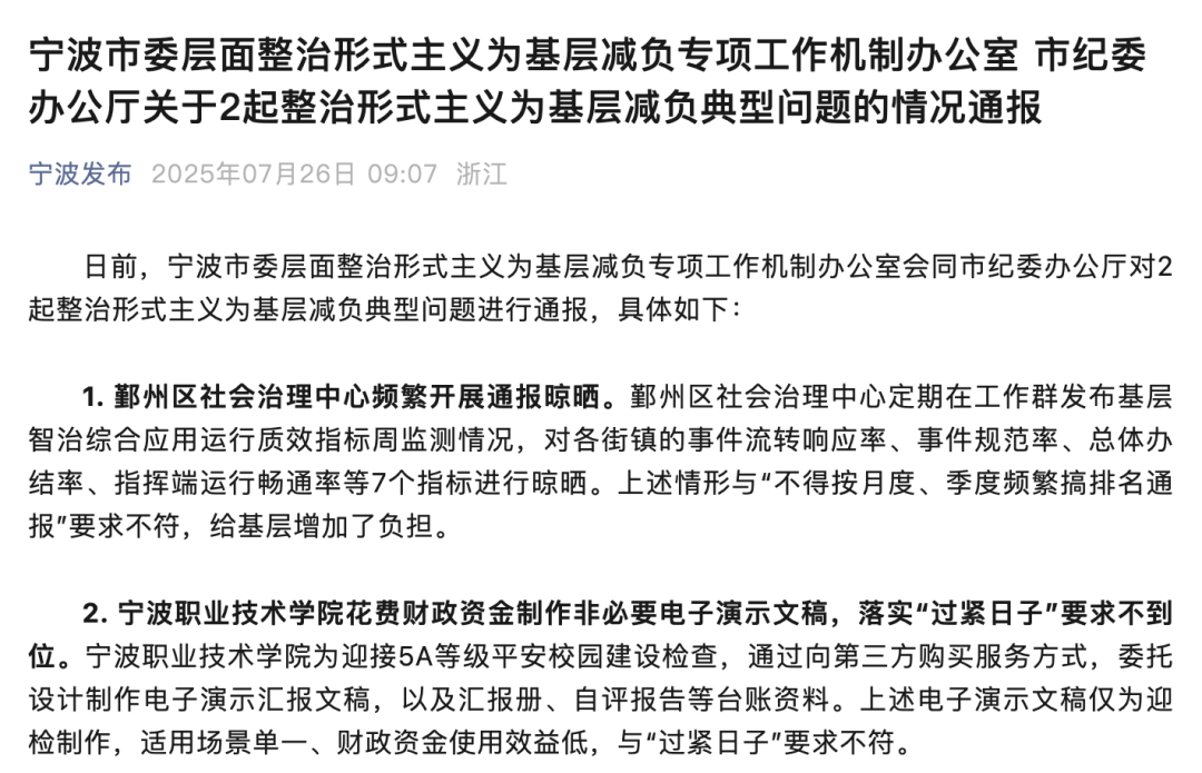 据“宁波发布”今天(7月26日)消息,日前融亿操盘,浙江省宁波市委层面整治形式主义为基层减负专项工作机制办公室会同市纪委办公厅对2起整治形式主义为基层减负典型问题进行通报。