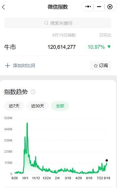 也有投资者对记者说,股市新高了,但好像周围没什么人聊股票。记者注意到,8月18日,“牛市”关键词在微信指数中创下年内新高,但较去年“924”行情高点依旧有数倍差距。